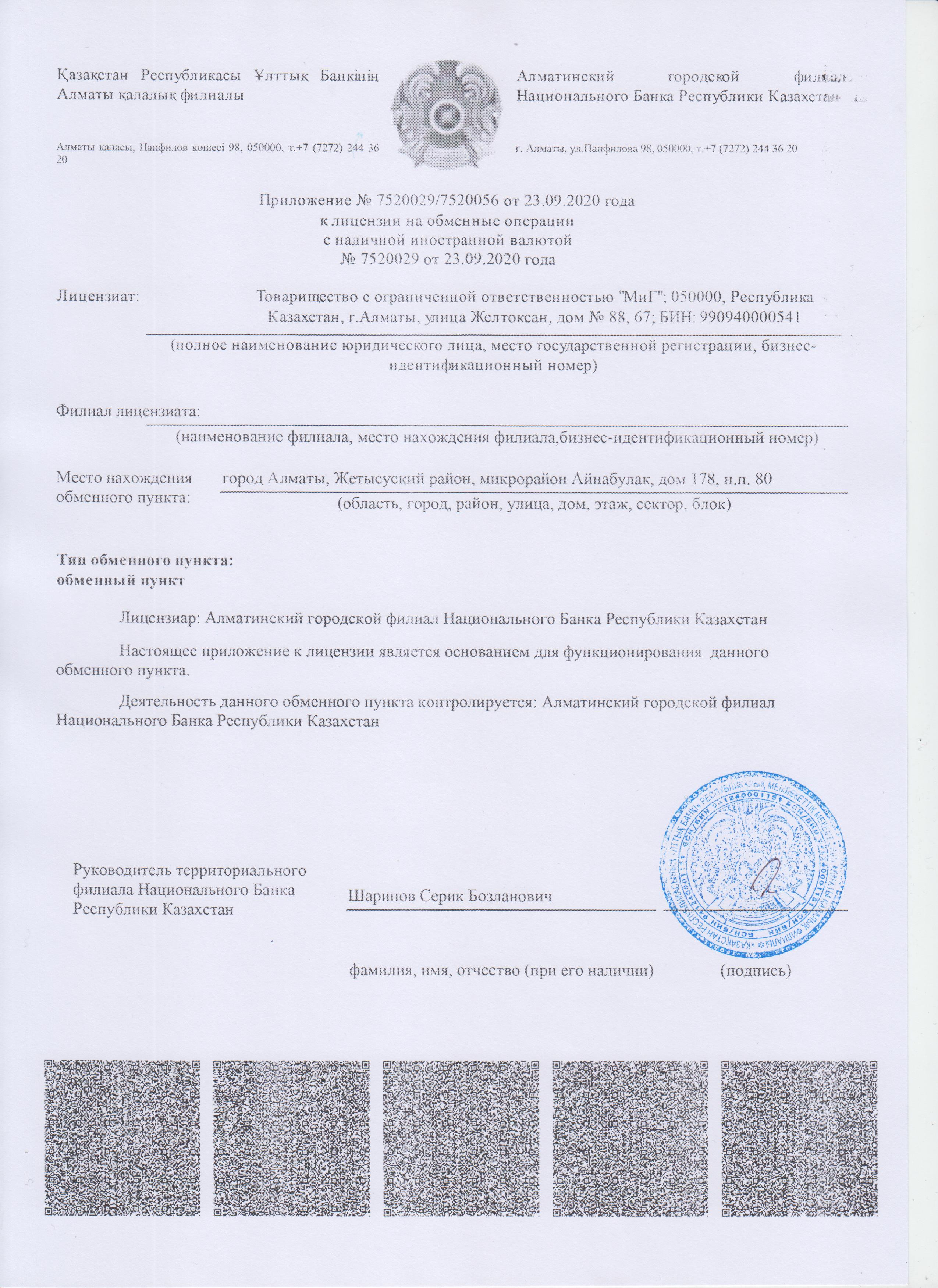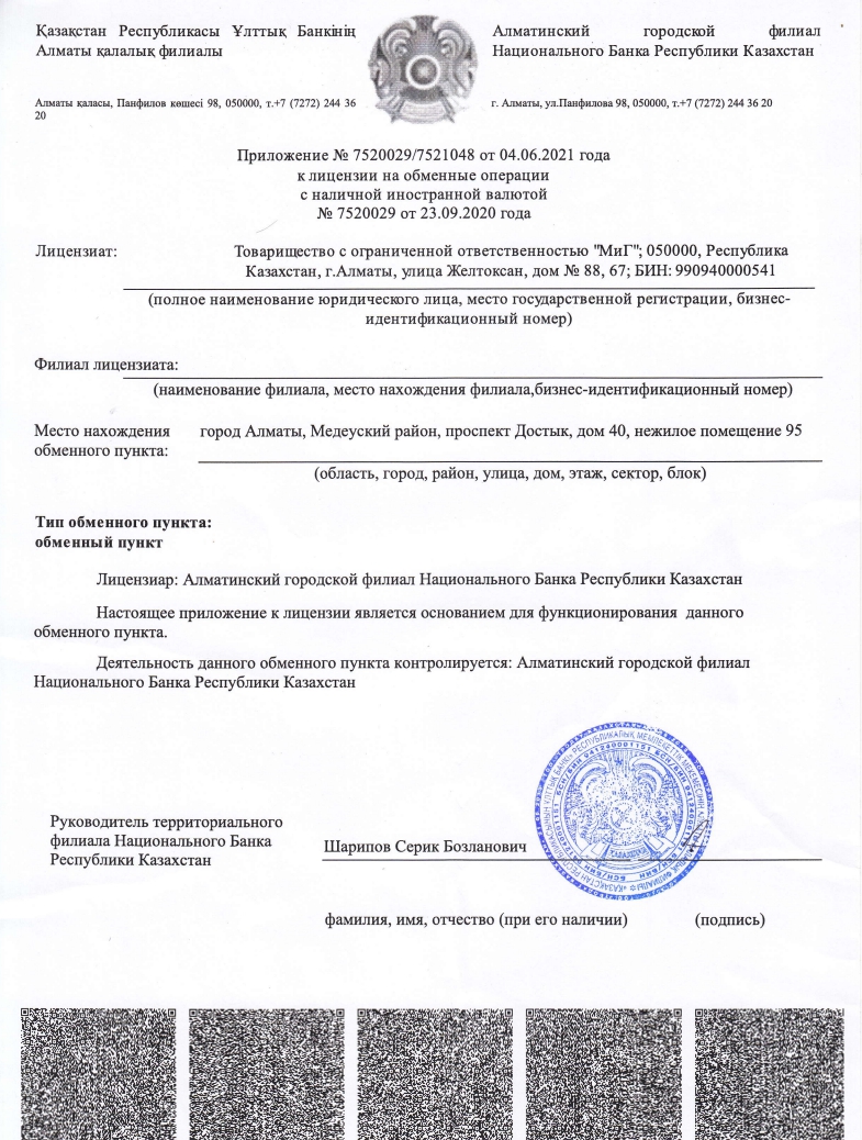 Деятельность обменных пунктов "МиГ" контролируется Алматинским городским филиалом Национального Банка Республики Казахстан. При наличии замечаний к работе обменного пункта просьба направлять жалобы по адресу: 050000 г. Алматы, ул. Панфилова, д. 98 (почтовый адрес территориального филиала Национального Банка Республики Казахстан). Для рассмотрения жалобы просьба сообщить в ней следующие сведения: